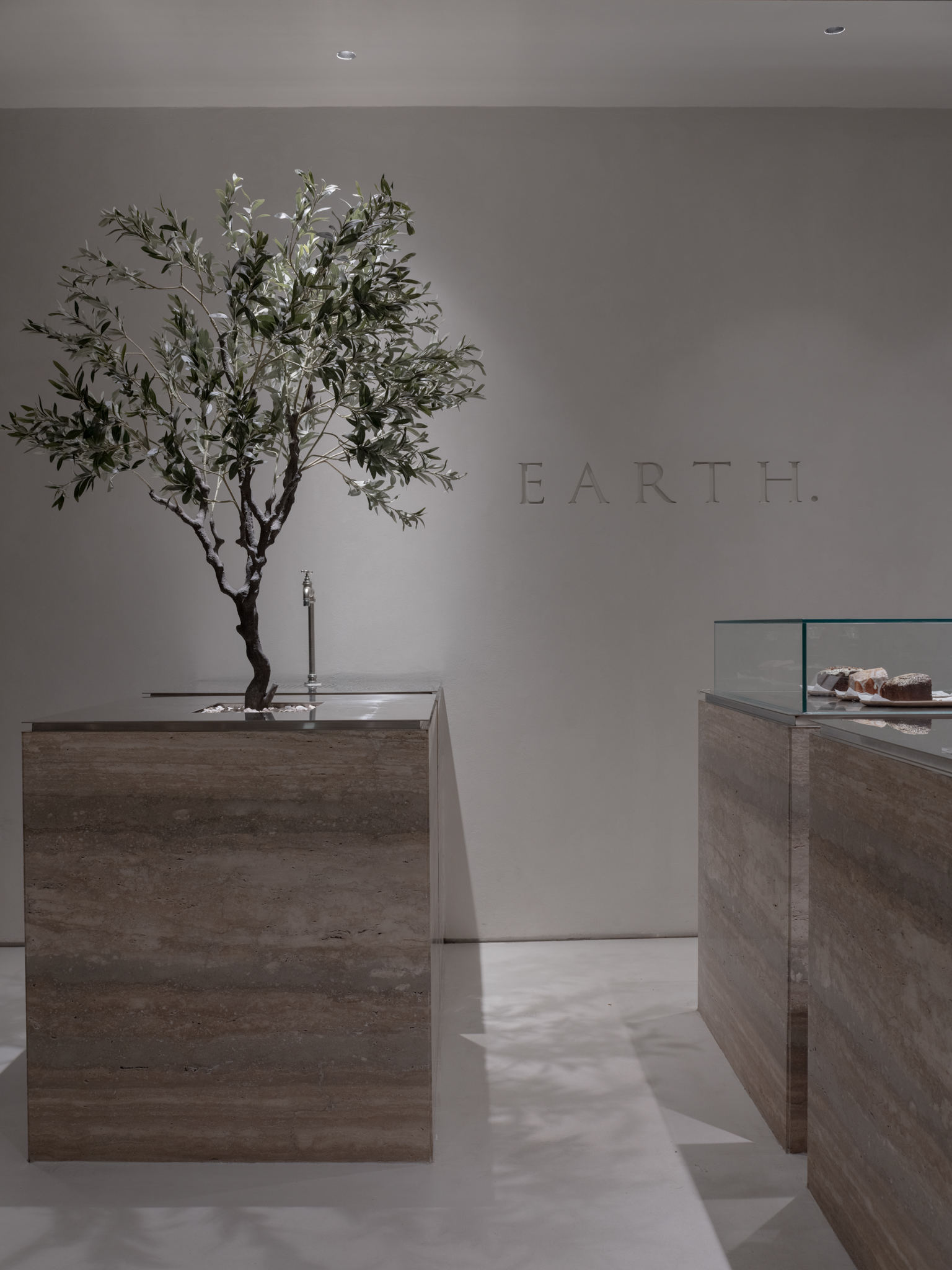Earth is an organic coffee bar based in Doha. For their first location, we aimed to create a soothing and calm environment using a minimal palette of silver travertine, stainless steel, oak wood, and beige micro cement.